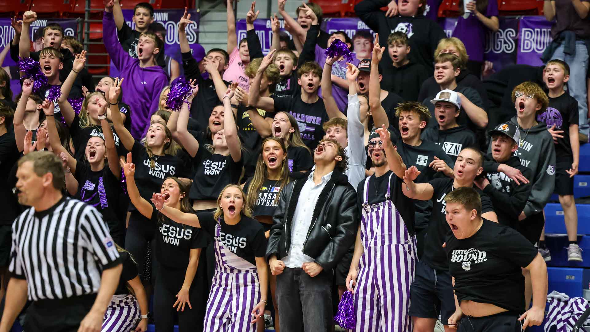 Baldwin’s student section celebrate a made 3-pointer against Rock Creek during the 4A state championship boys basketball game on March 14 at Hutchinson Sports Arena.