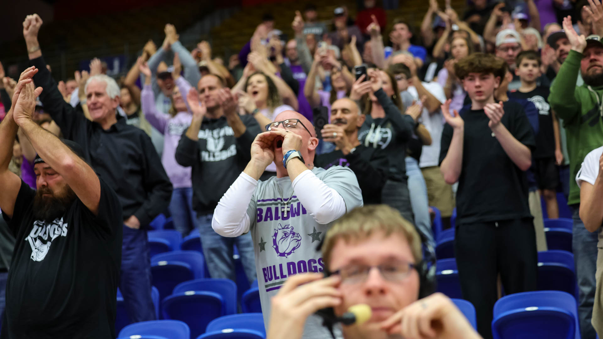Baldwin’s fans cheer on the Bulldogs during the trophy ceremony after the team won against Rock Creek in the 4A state championship boys basketball game on March 14 at Hutchinson Sports Arena.