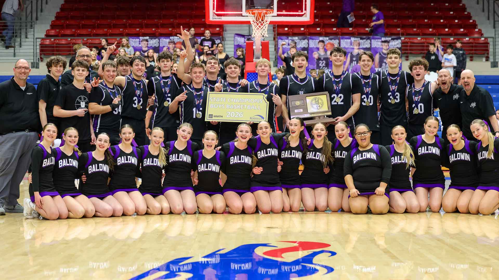 The Baldwin boys basketball team stands in the back with the Baldwin cheer team seated up front as the group poses after the Bulldogs defeated Rock Creek in the 4A state championship boys basketball game on March 14 at Hutchinson Sports Arena.