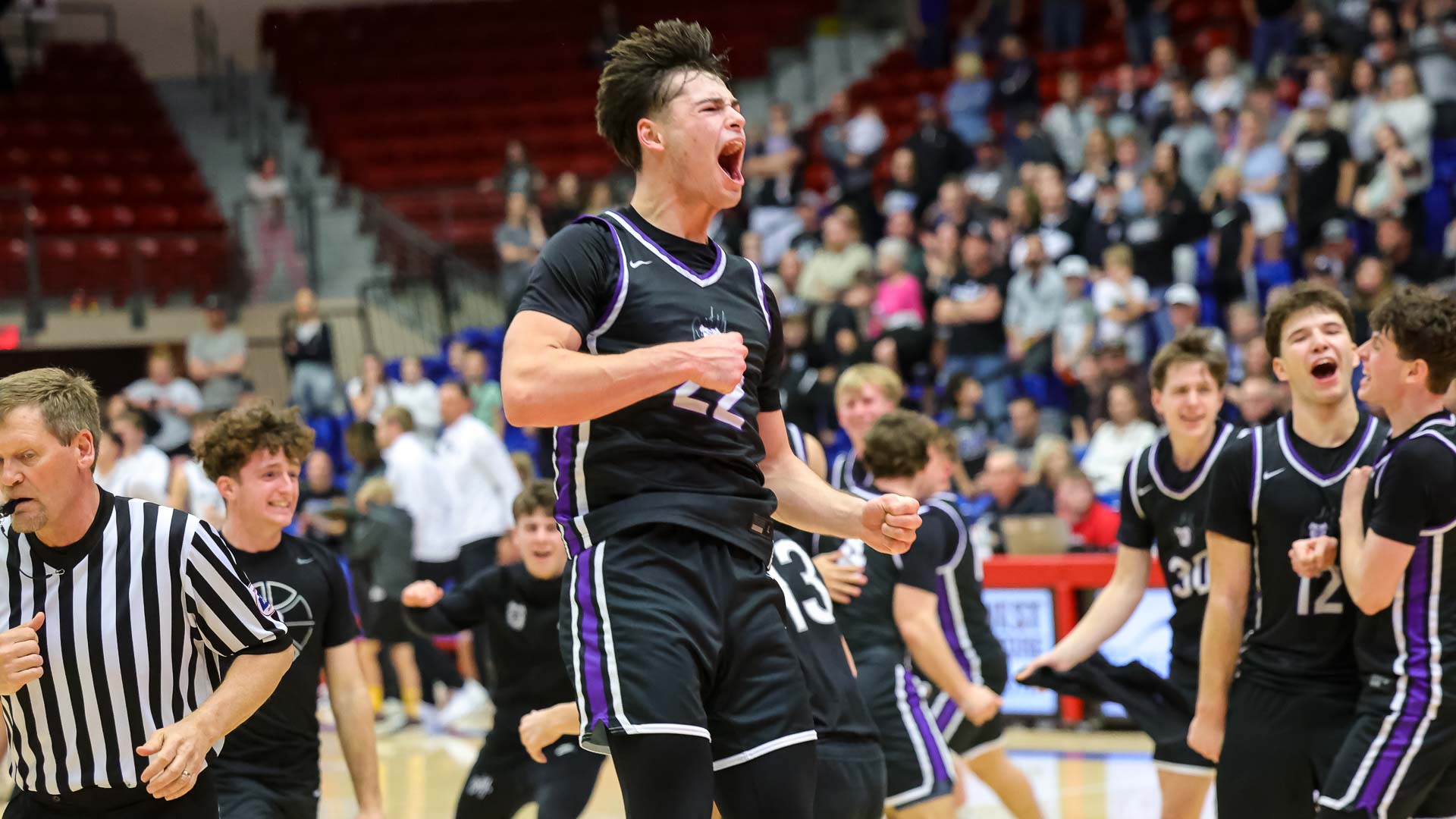 Baldwin’s Leo Schoenberger jumps up into the air for the first of multiple fist pumps to celebrate defeating Rock Creek in the 4A state championship boys basketball game on March 14 at Hutchinson Sports Arena.