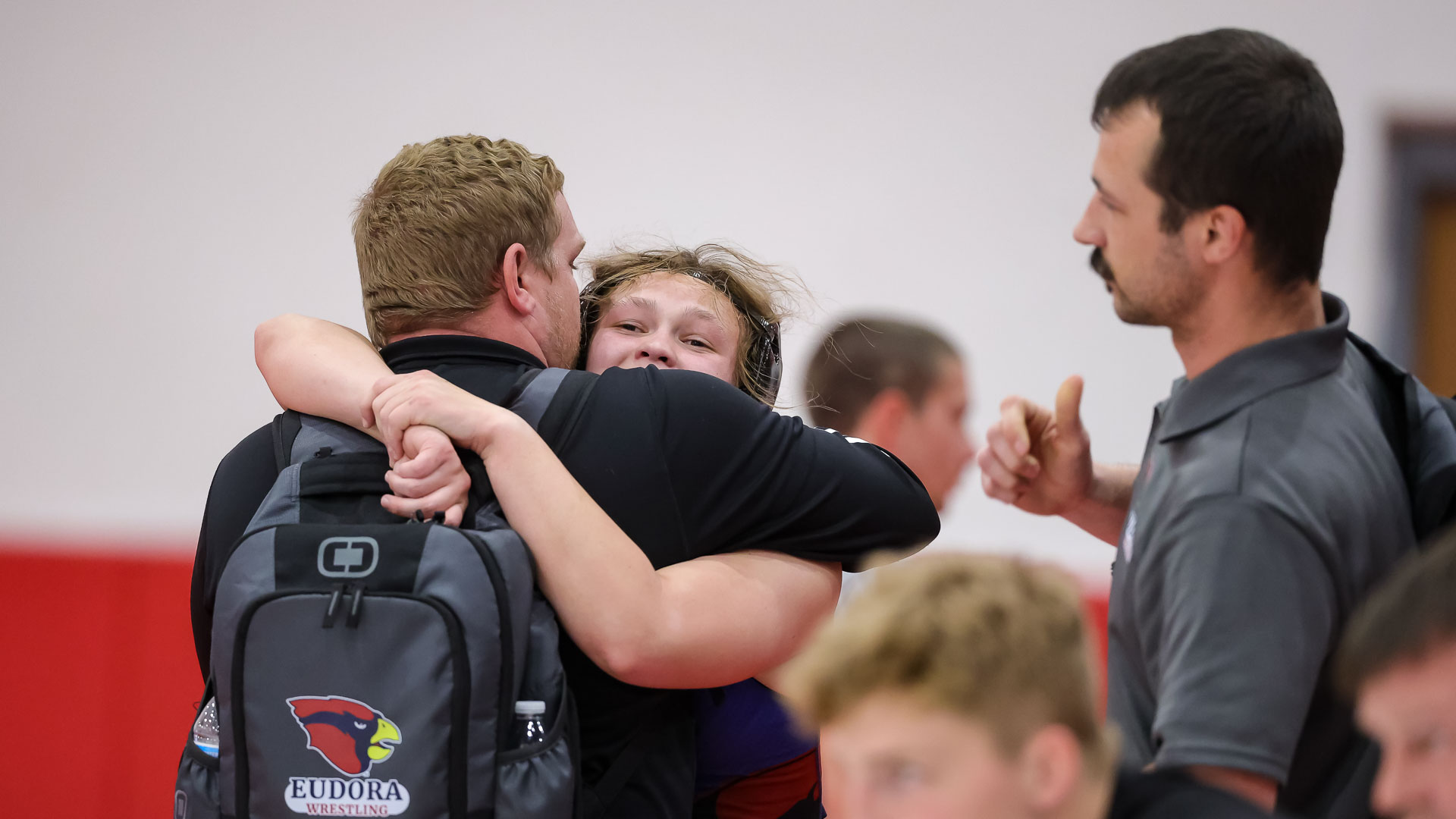 Eudora’s Abby Fager hugs one of her coaches after winning her semifinals match during the 4A East Regional girls wrestling tournament on Feb. 14 at Tonganoxie High School.