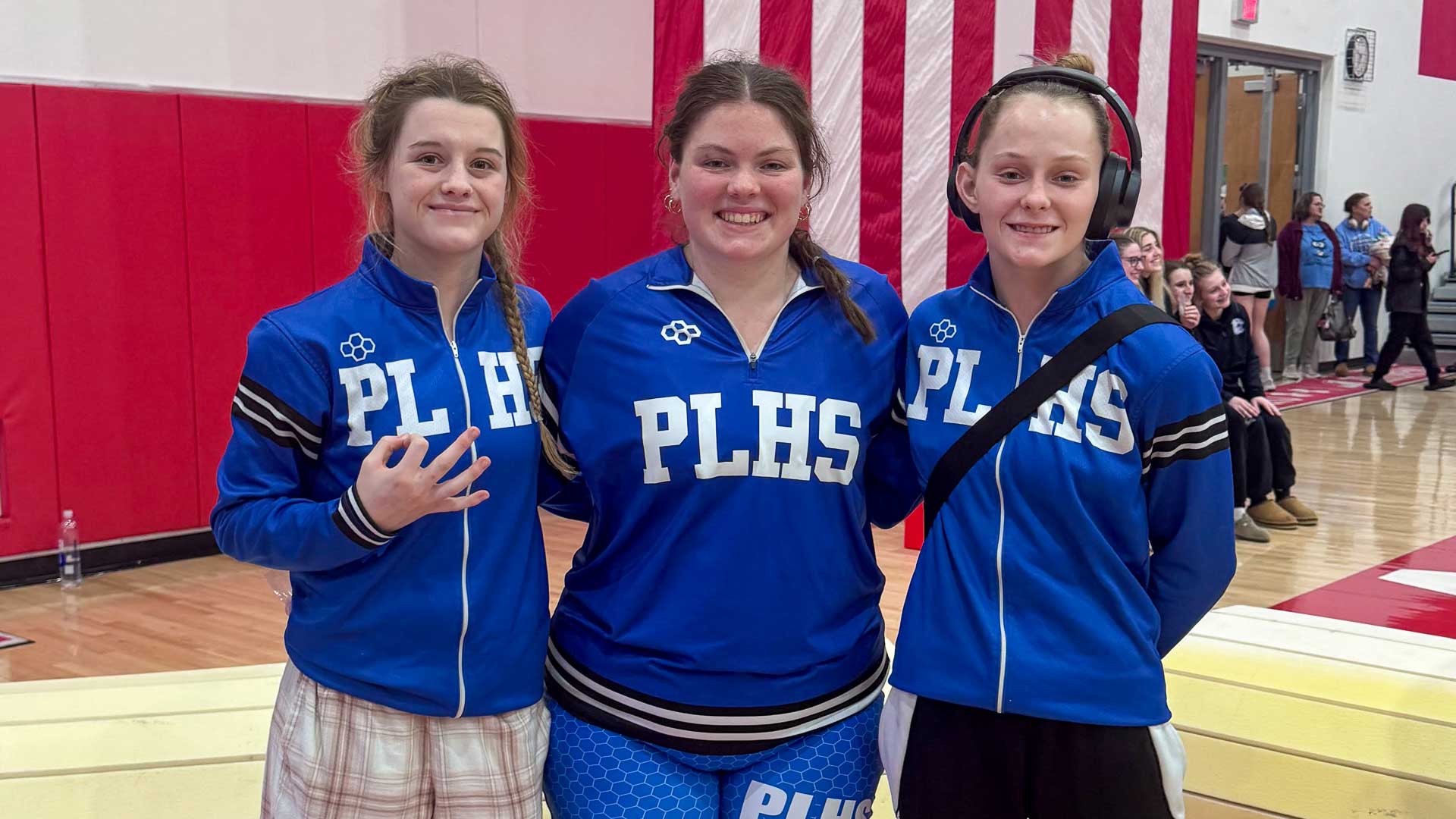 Perry-Lecompton’s Jolie Corcoran, Taylee Howard and Samantha Hutton pose for a photo after the 4A East Regional girls wrestling tournament on Feb. 14 at Tonganoxie High School.