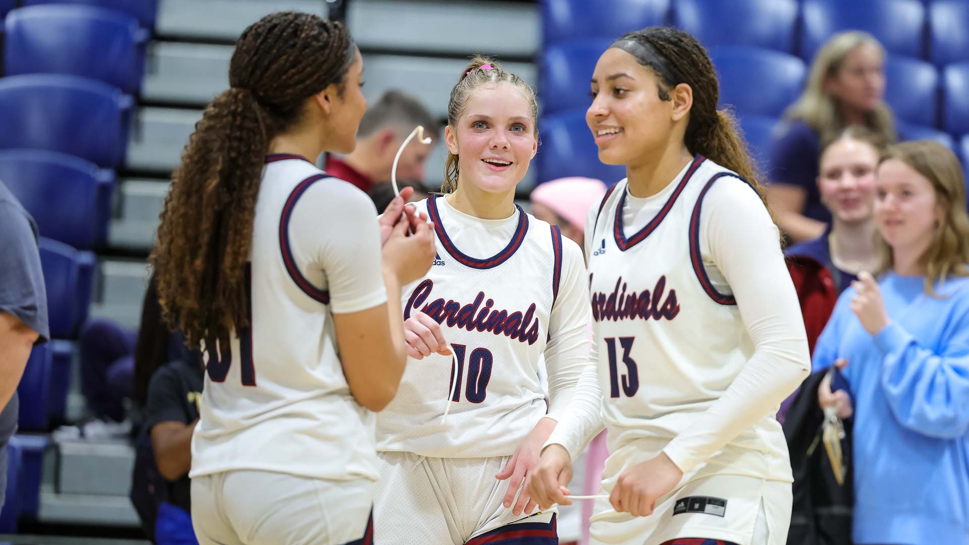 Eudora’s Jayla Colter, Brynn Deterding and Avah Dye huddle up holding their pieces of the net after the Cardinals won a sub-state girls basketball game against Ottawa on March 6 at Eudora High School.
