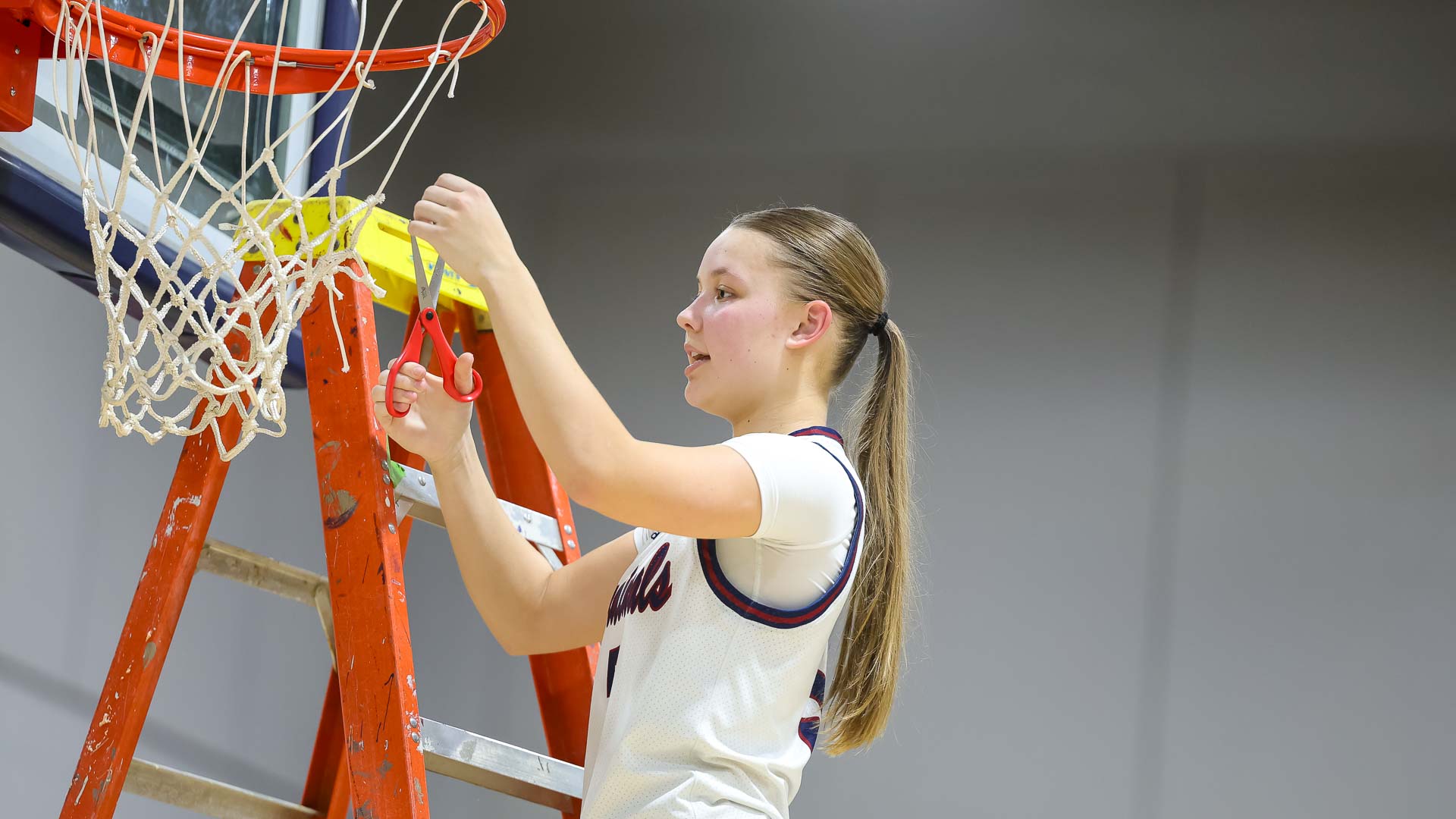 Eudora’s Payton Lewis cuts down a piece of the net after her team won a sub-state girls basketball game against Ottawa on March 6 at Eudora High School.