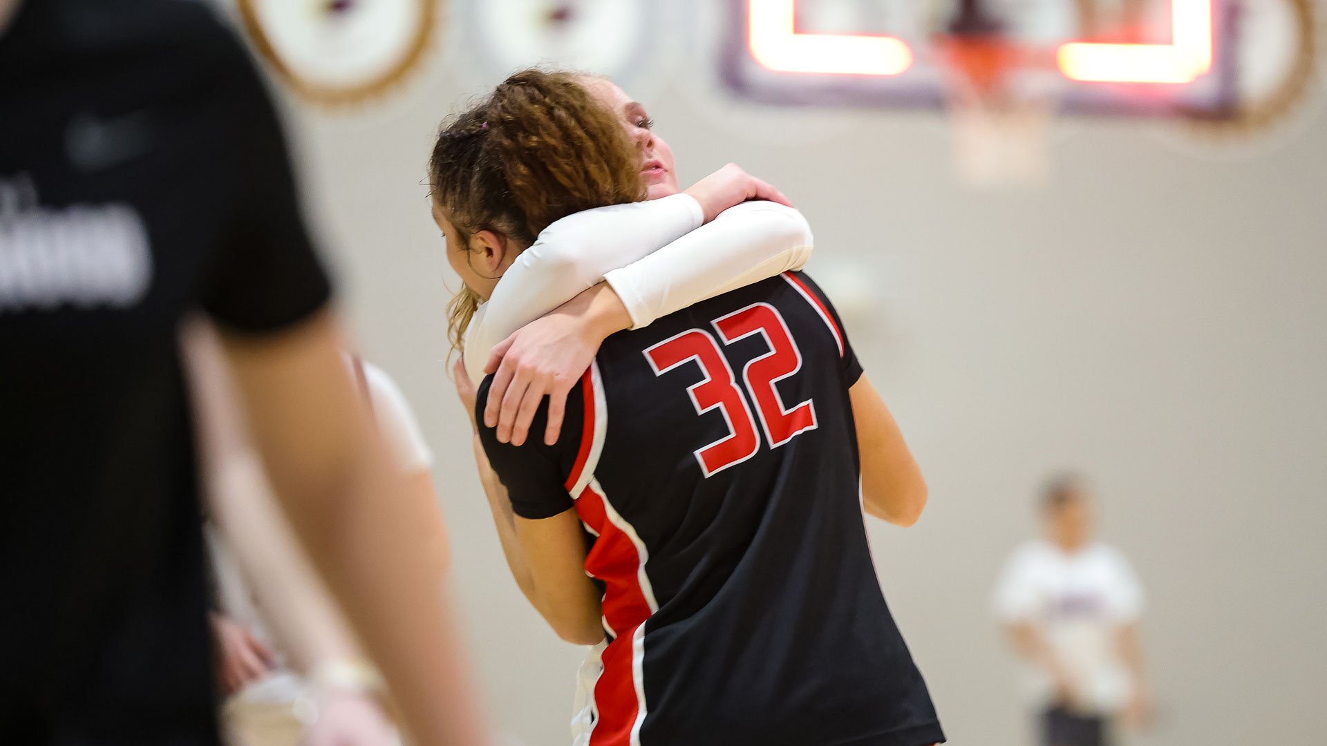 Eudora’s Brynn Deterding hugs Ottawa’s Leah Askins-Dieterich following a girls basketball game on March 6 at Eudora High School.
