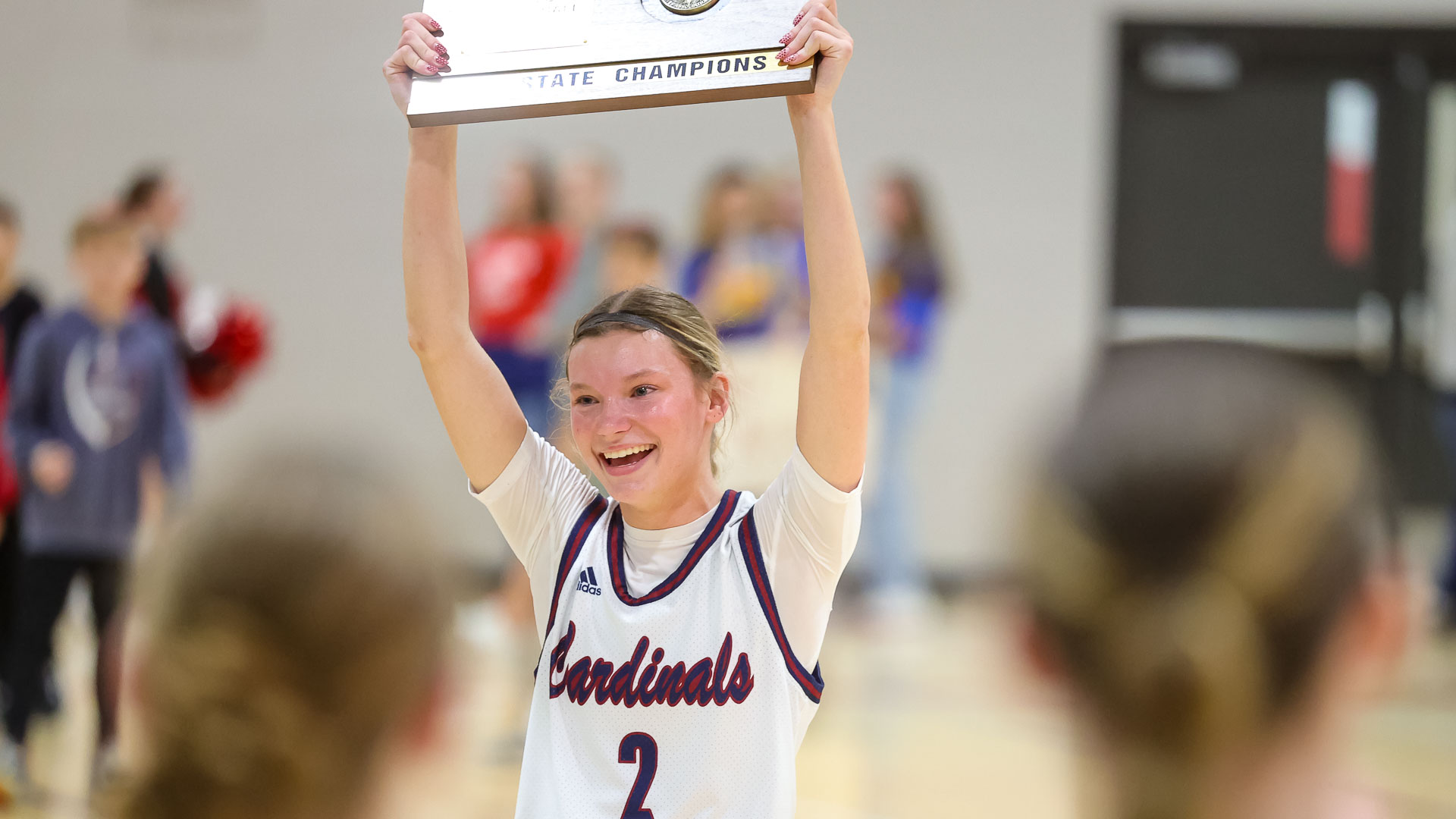 Eudora’s Avery Warren lifts up the sub-state championship trophy in celebration of the Cardinals won a girls basketball game against Ottawa on March 6 at Eudora High School.
