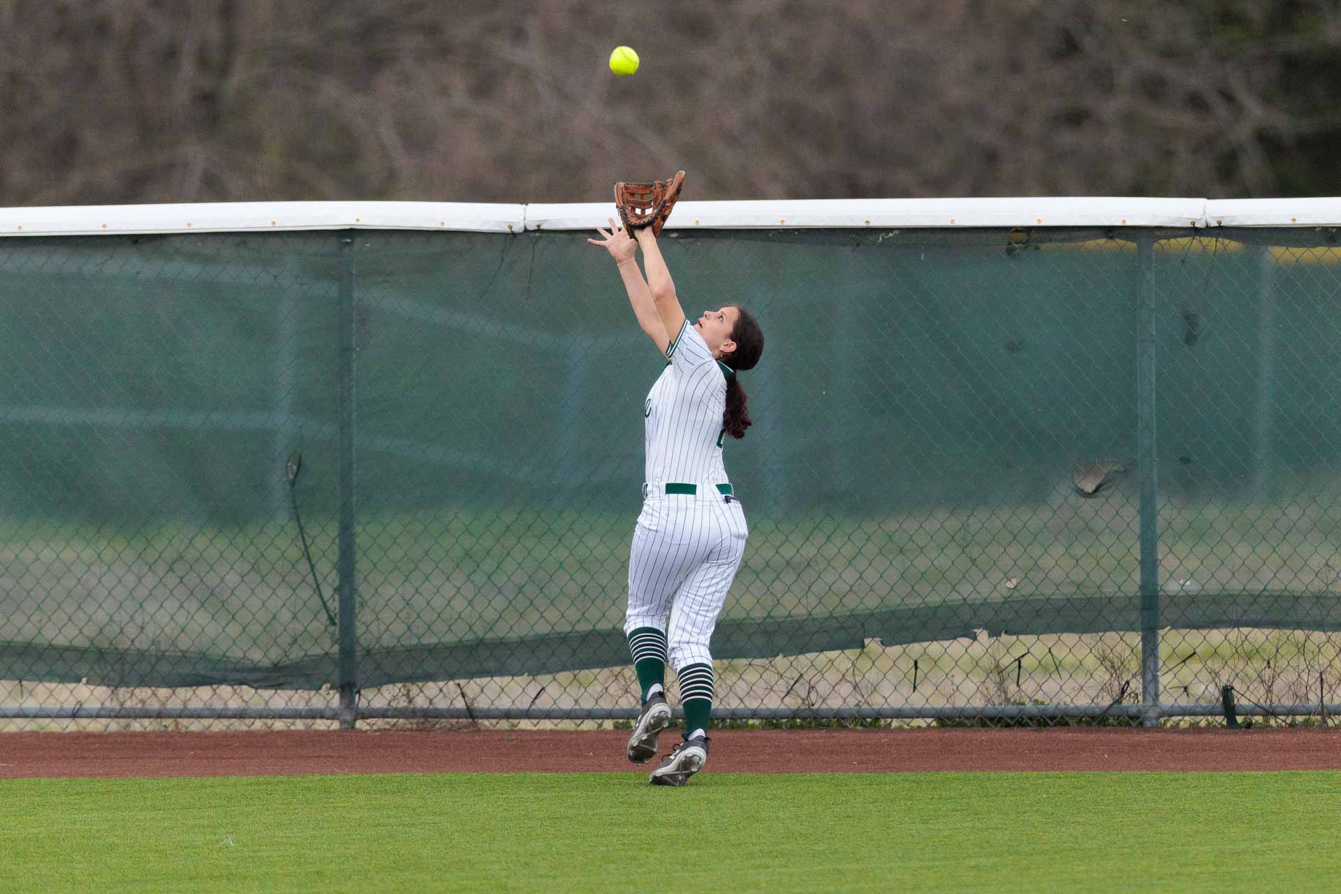 Free State’s Riley Schierling readies to catch a deep shot near the ball against Olathe Northwest during a softball game on March 27 at Free State High School in Lawrence.