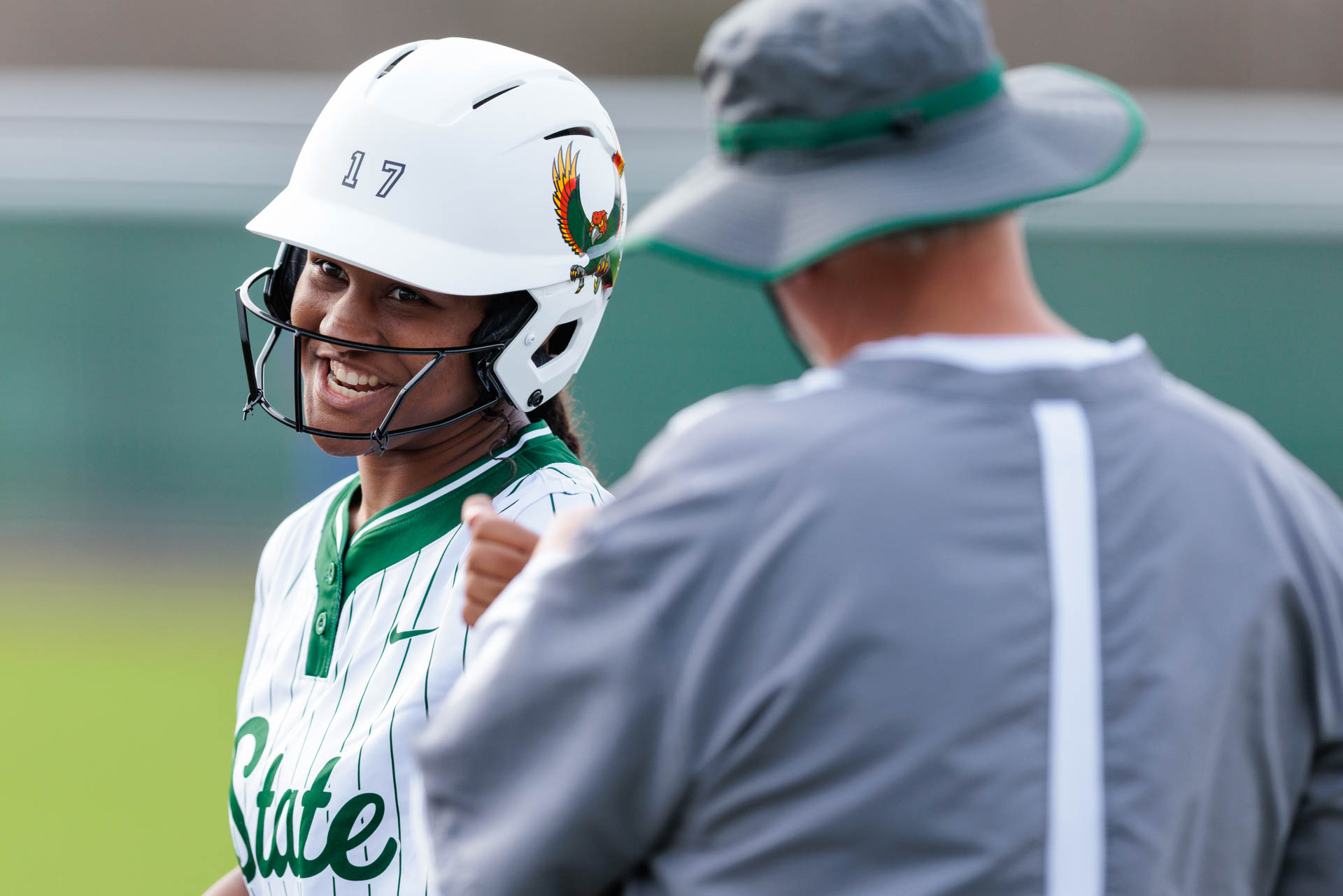 Free State’s Sarai Preston smiles as she awaits a fist bump from her coach during a softball game against Olathe Northwest on March 27 at Free State High School in Lawrence.