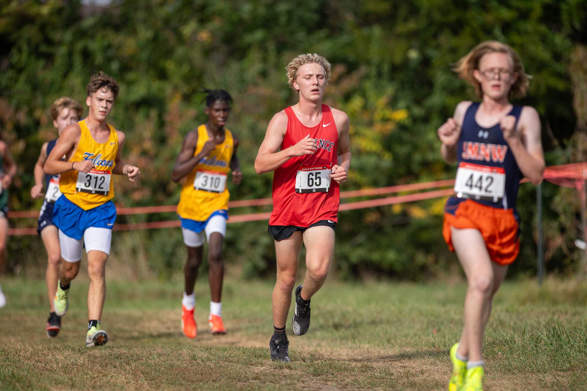Lawrence High’s Tyler Urban leads the way for the Lions JV squad who ran in relief of the varsity runners during the Billy Mills Classic cross country race Oct. 11 at Haskell Indian Nations University in Lawrence.