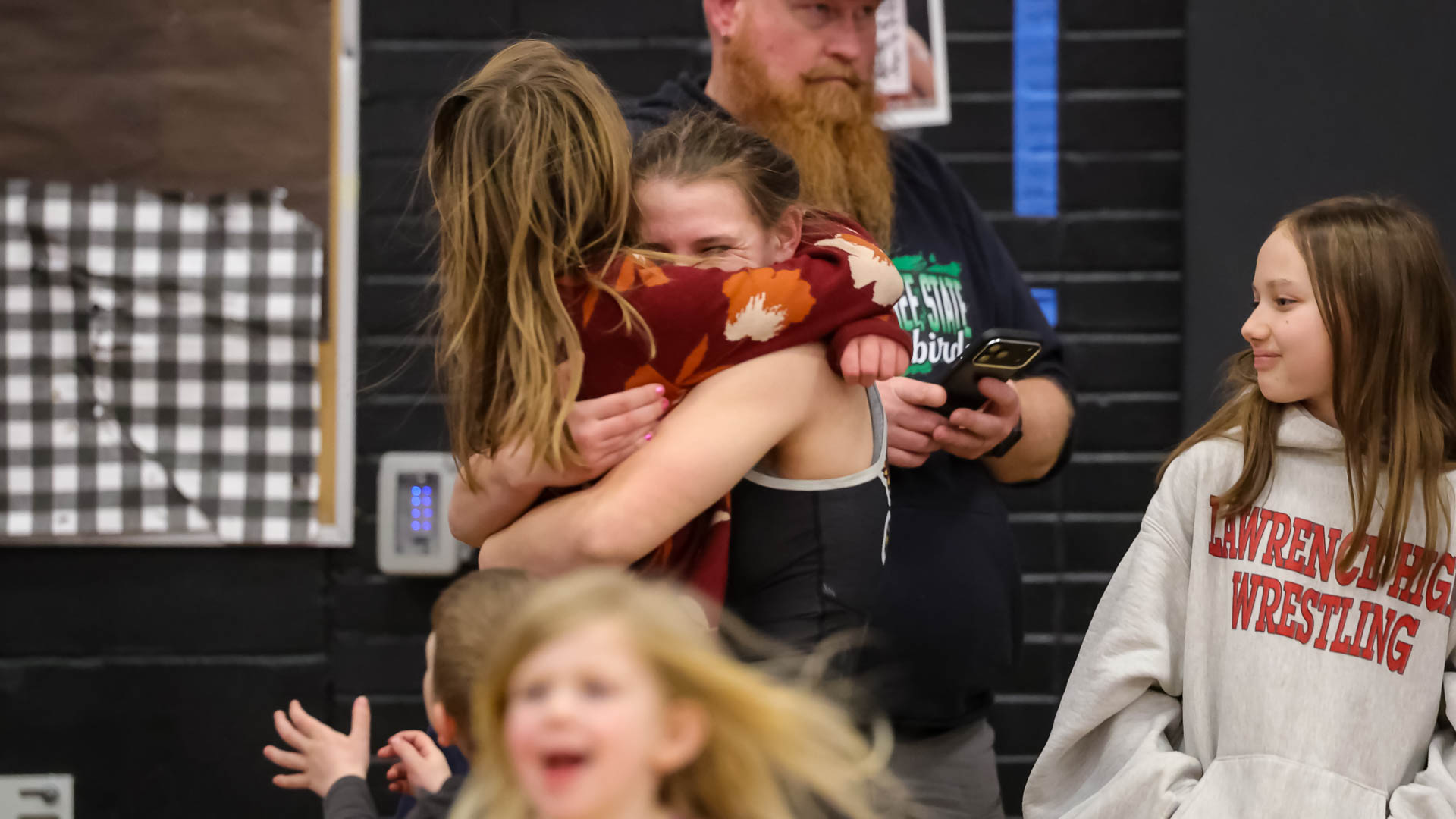 Free State’s Jessica Berg celebrates a victory with a hug during the girls wrestling edition of the City Showdown against Lawrence High on Jan. 21 at Lawrence High School.