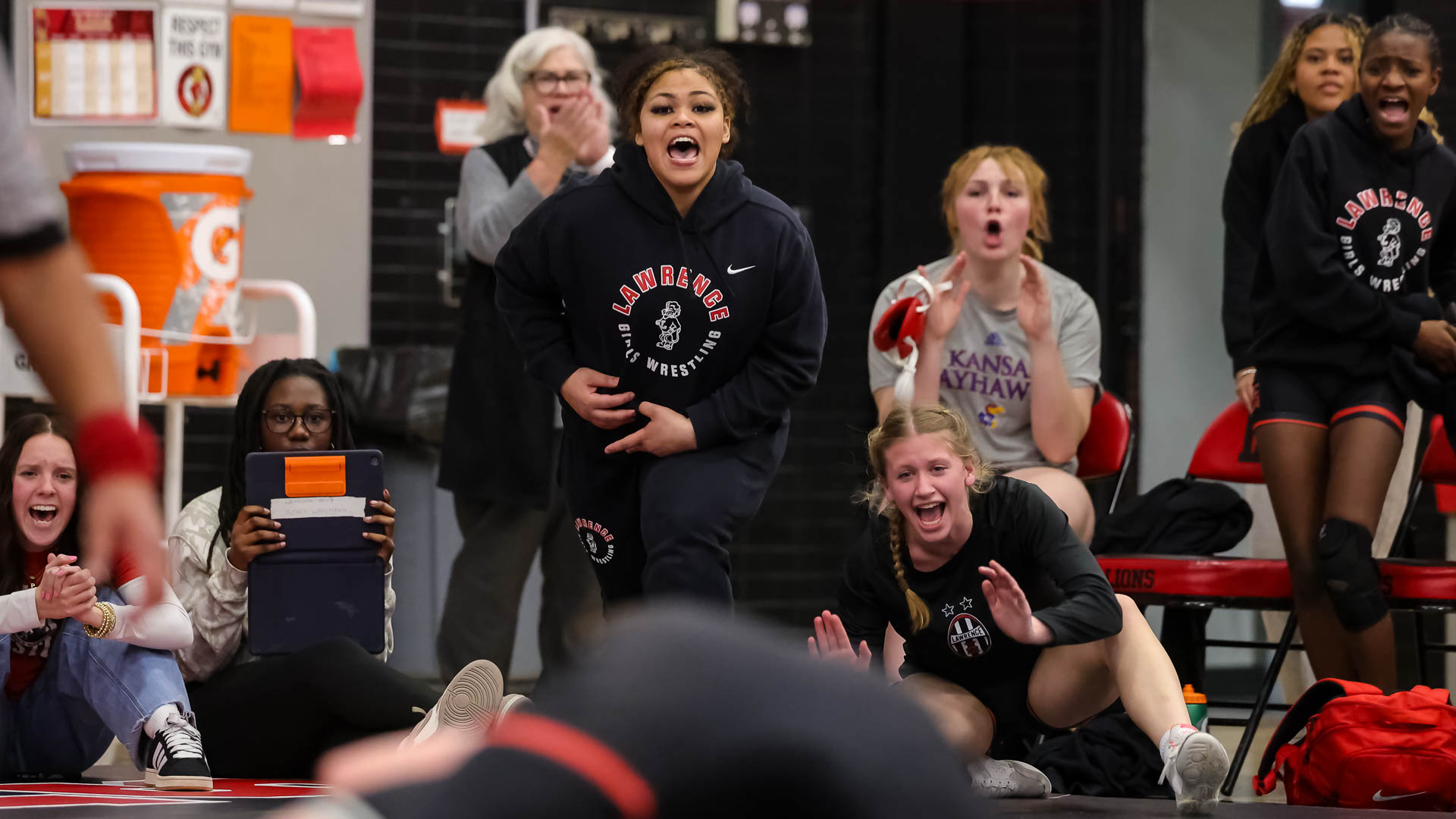Lawrence High wrestlers cheer on their teammate during a match at the girls wrestling edition of the City Showdown against Free State on Jan. 21 at Lawrence High School.