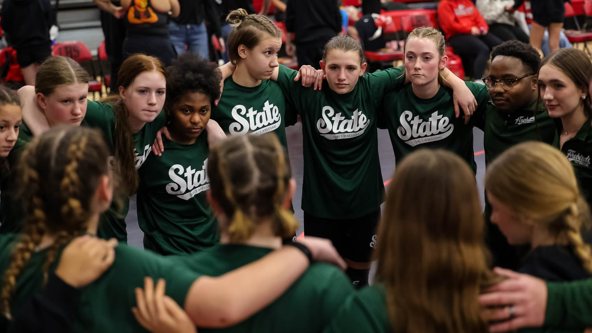 The Free State girls wrestling team huddles up before the girls wrestling edition of the City Showdown against Lawrence High on Jan. 21 at Lawrence High School.