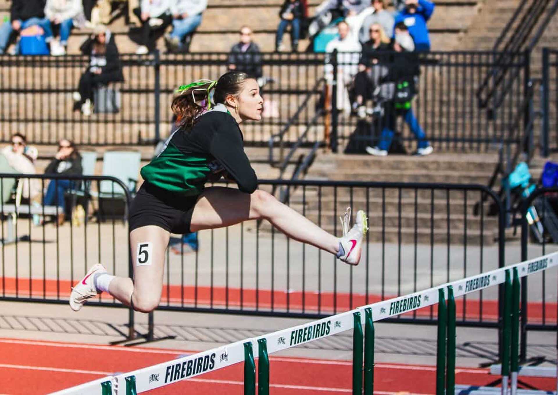 Free State’s Shana Teenor jumps into the air to clear a hurdle in one of her events during the Early Bird Invitational on March 27 at Free State High School in Lawrence.
