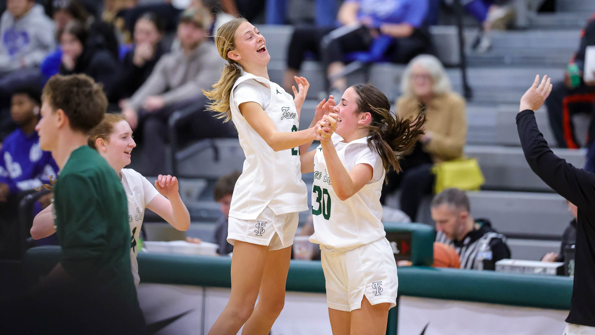 Free State’s Taylor Hulcher and Morgan McClorey celebrate after a girls basketball game against Junction City at Free State High School.