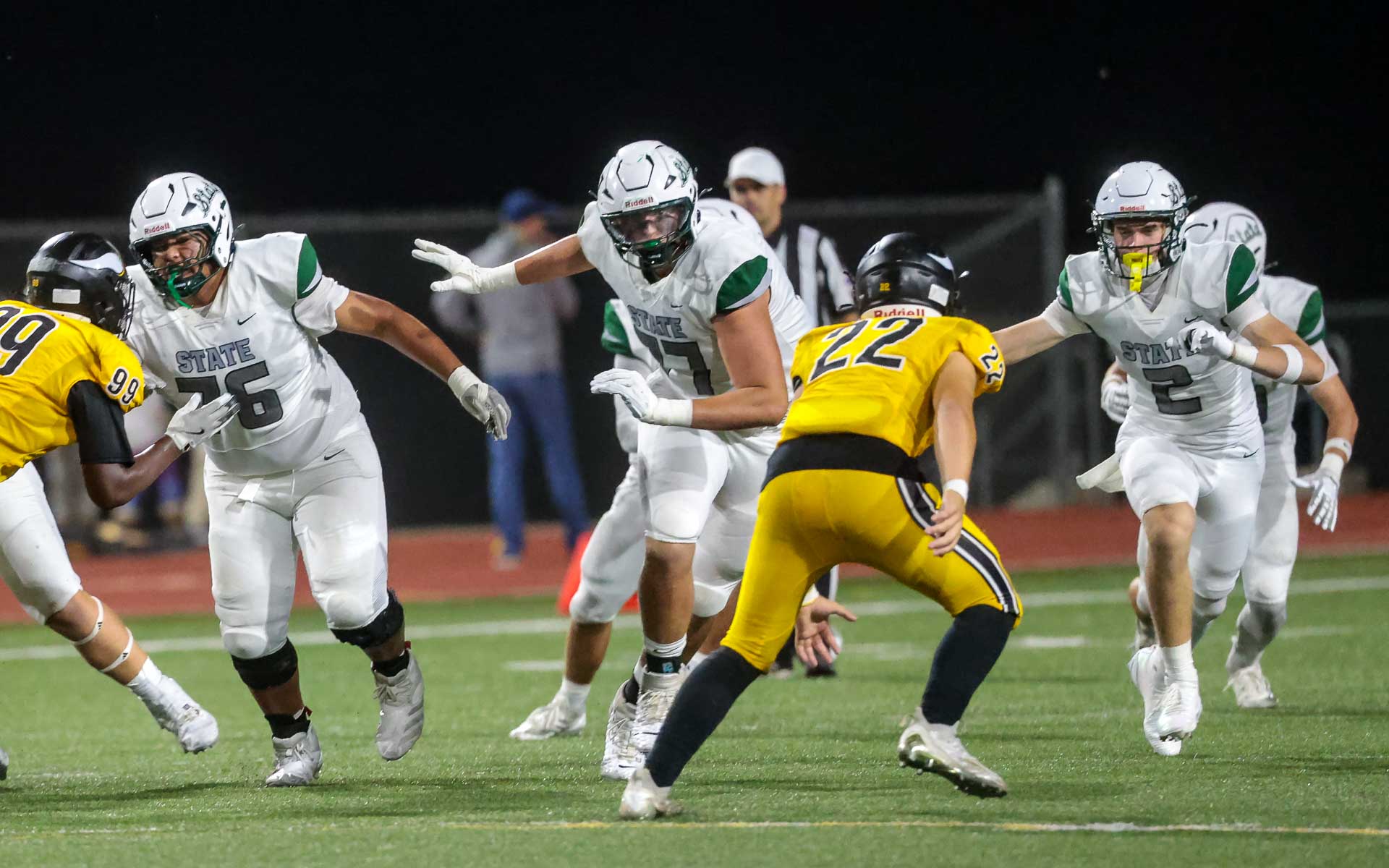 Free State’s Braden Wilmes maintains a block while his quarterback Finn Moore follows him during a running play in a football game this season.