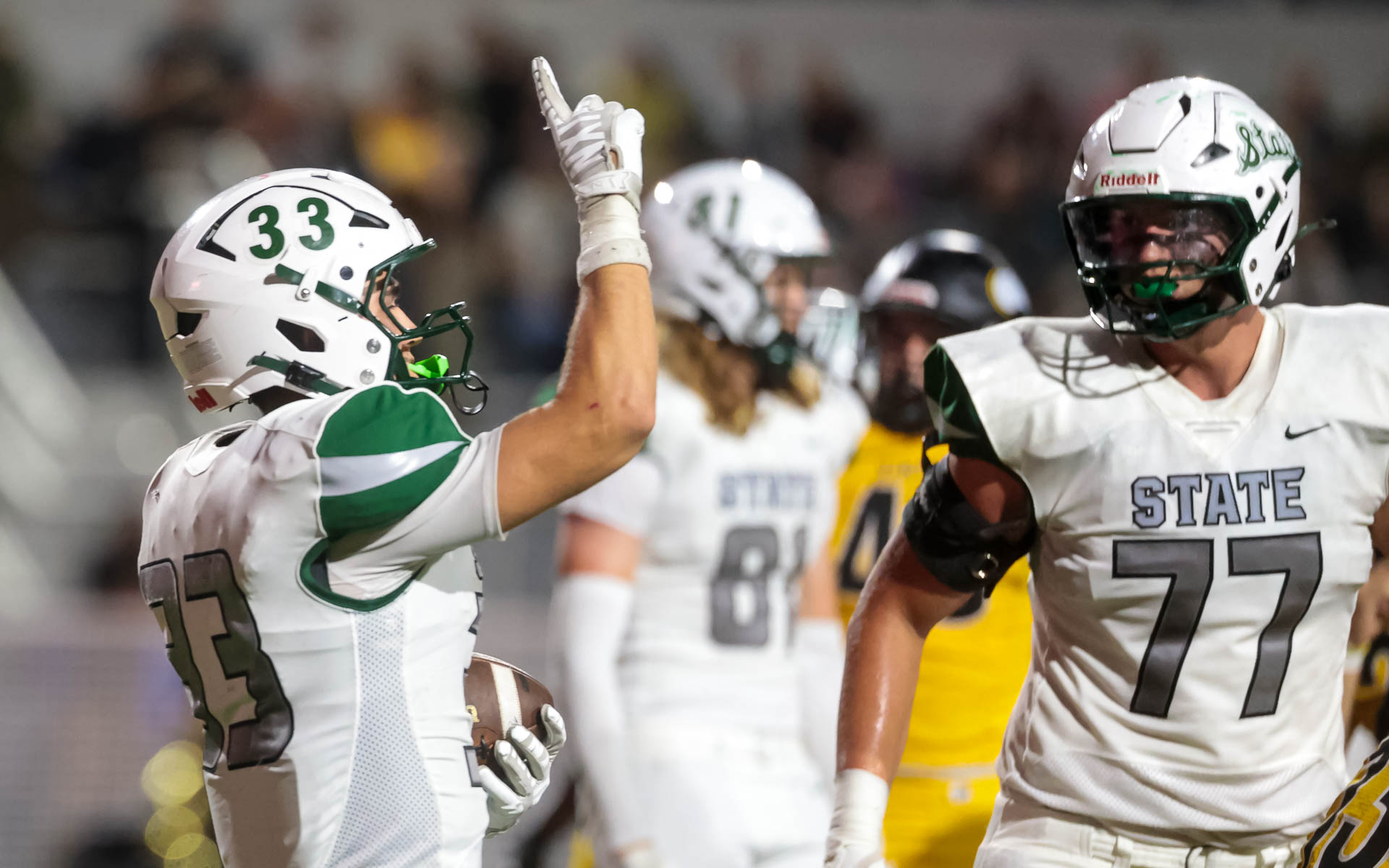 Free State’s Braden Wilmes runs up to celebrate a touchdown by Maddon Brittingham (33) during a football game this season.