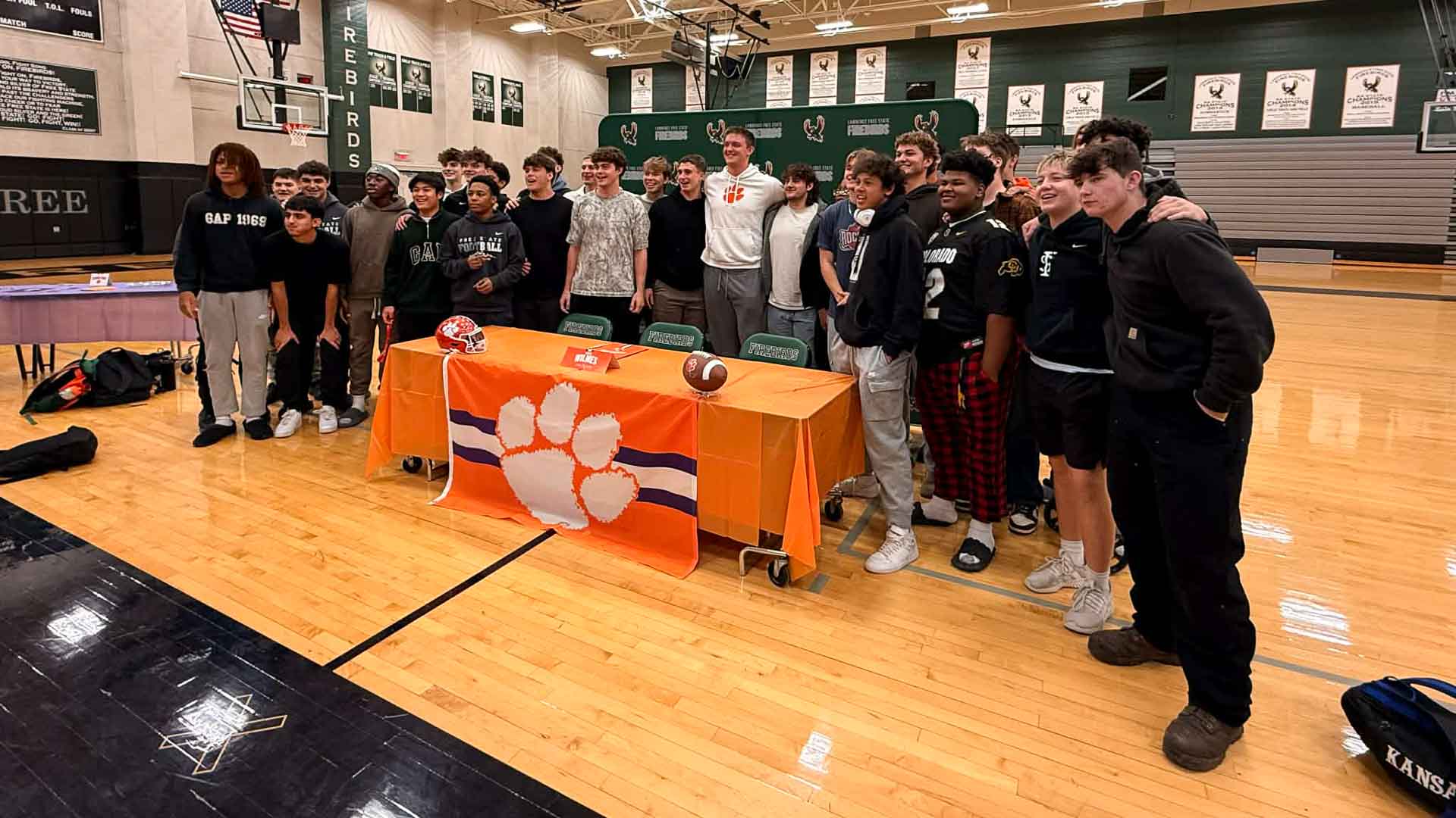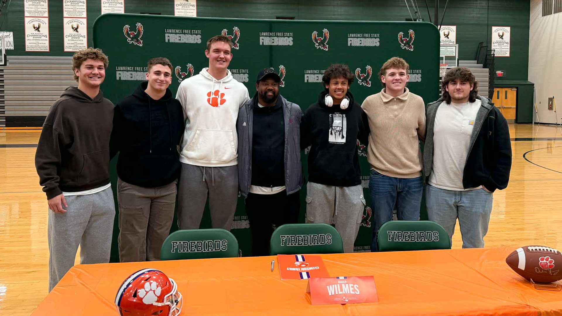 Free State’s Braden Wilmes poses for a photo with his Firebird teammates during signing ceremony where he committed to playing football at Clemson University.