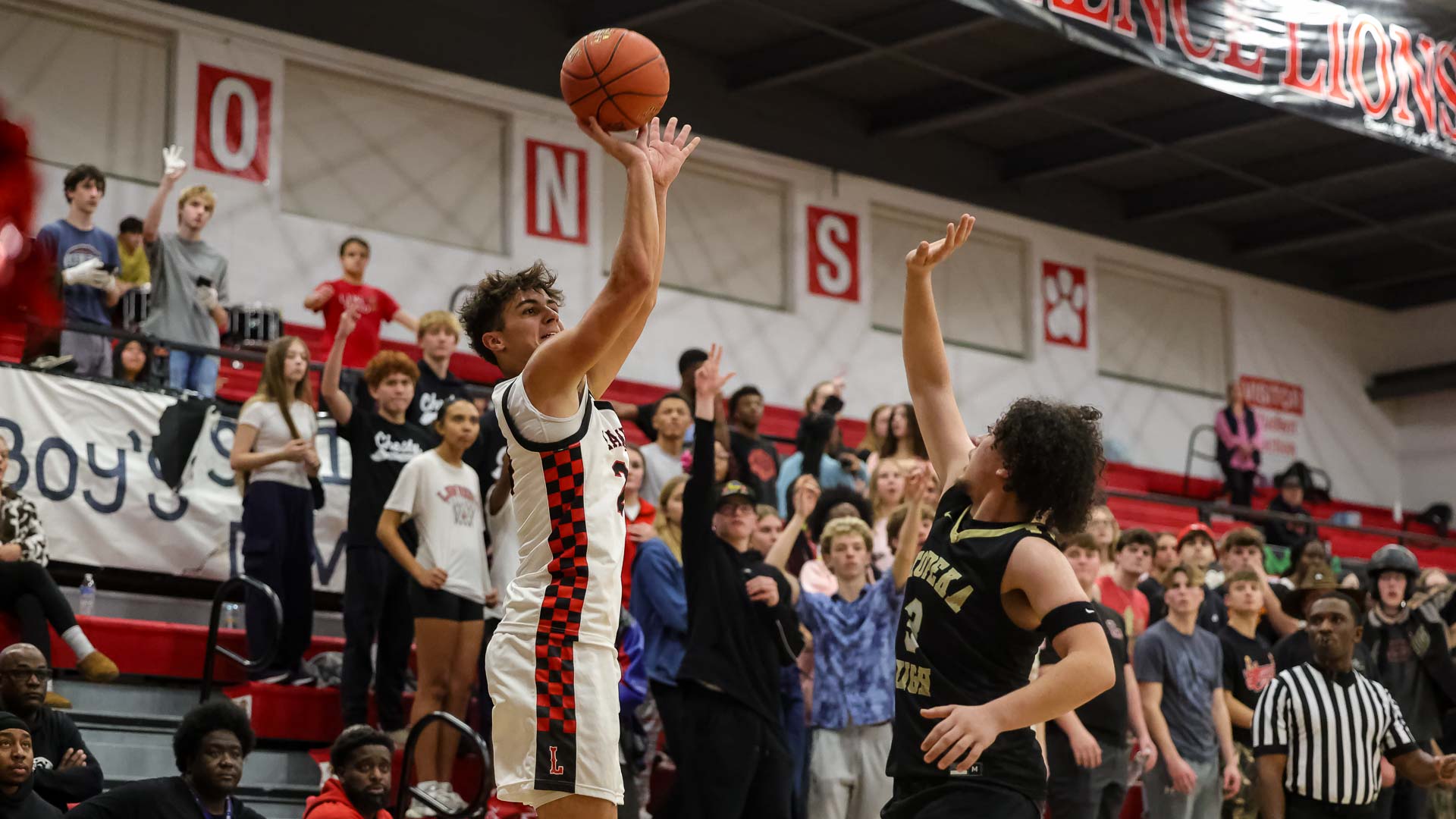Lawrence High’s Joey Dooley shoots a 3-pointer right in front of the Lions’ student section during a boys basketball game against Topeka High on Jan. 6 at Lawrence High School.