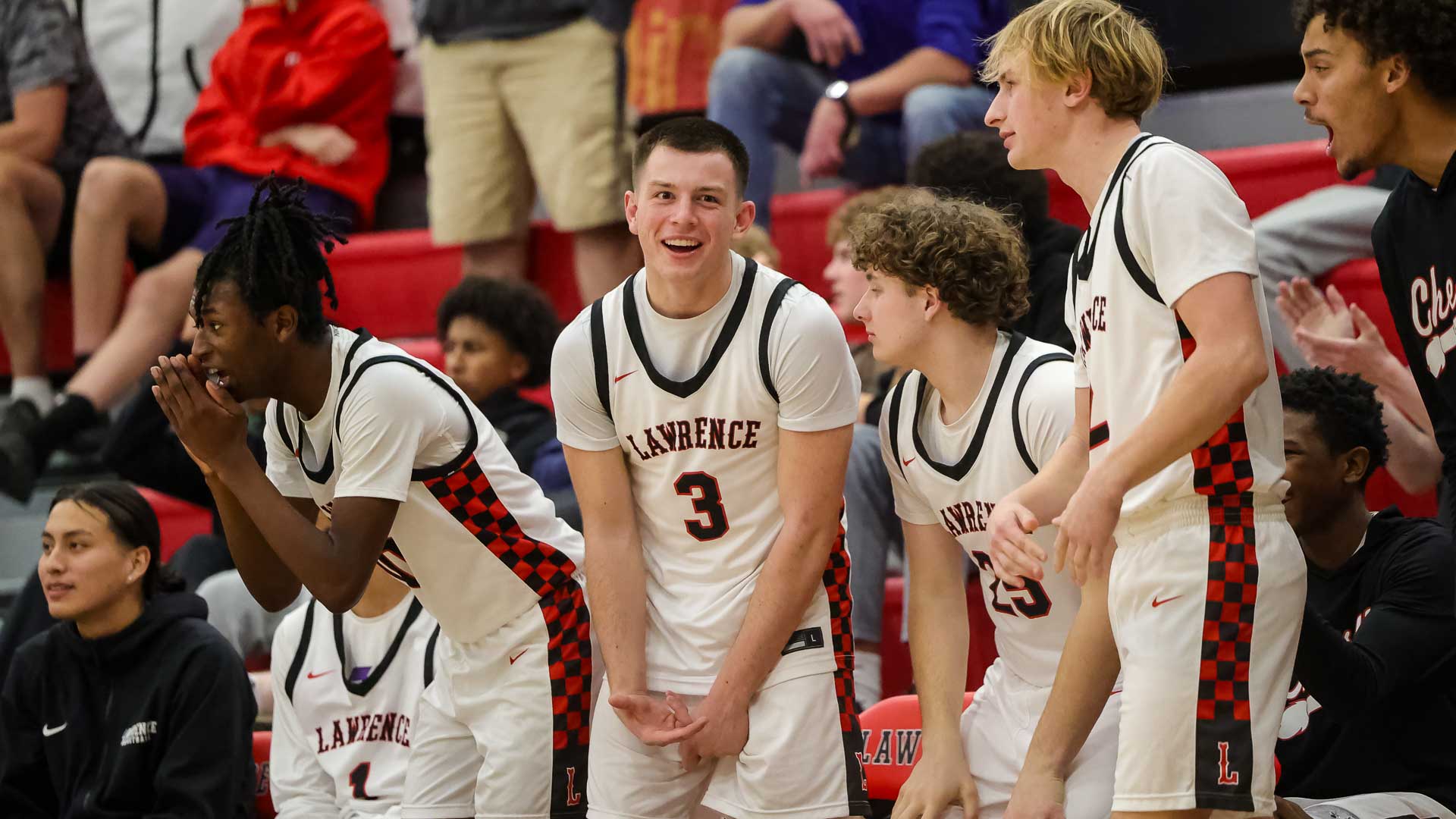 Lawrence High’s bench celebrates a fourth-quarter score during a boys basketball game against Topeka High on Jan. 6 at Lawrence High School.