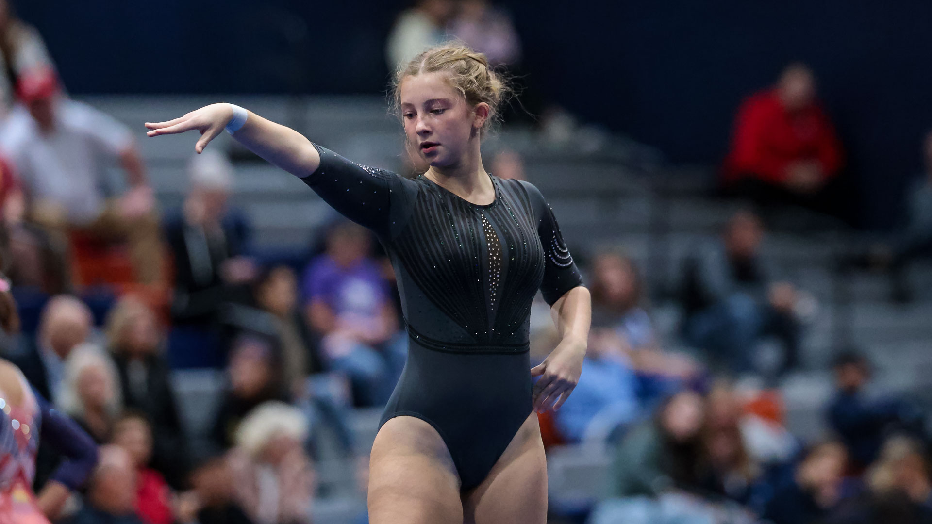 Free State’s Lucy Koch performs her floor routine during the state gymnastics meet.