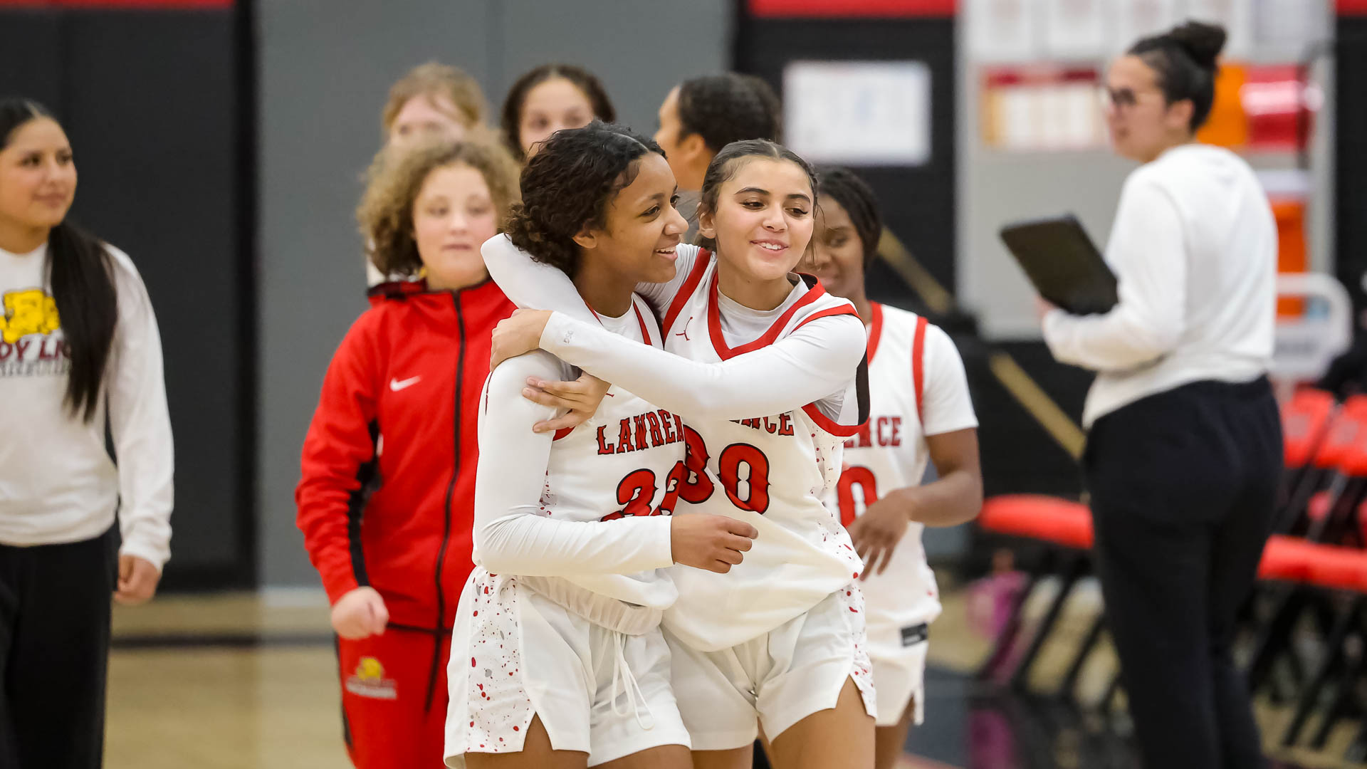Lawrence High’s LaKeyshia Woods and Jada Baars-Turner hug after a girls basketball game against Shawnee Mission West on Jan. 22 at Lawrence High School.