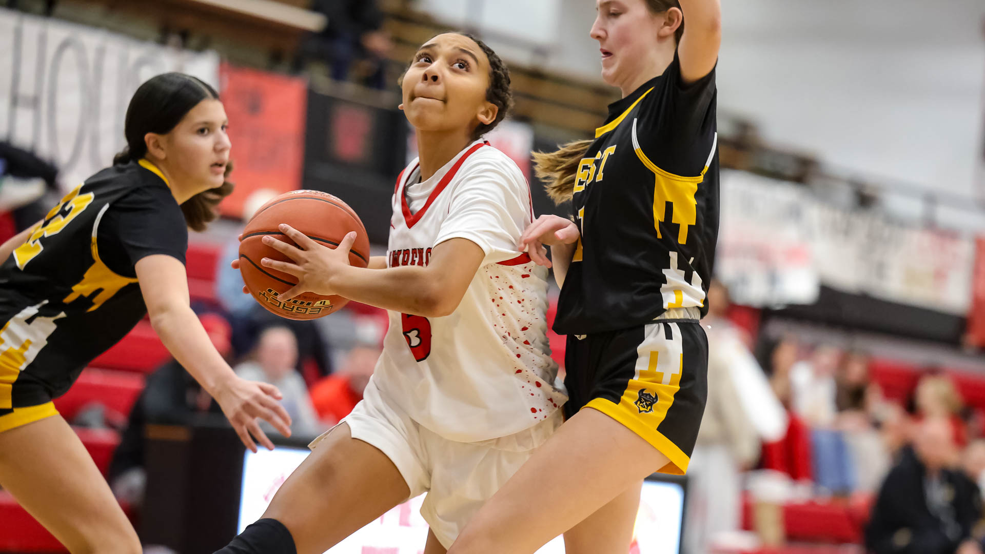Lawrence High’s Marley Doleman splits a pair of defenders while driving toward the basket during a girls basketball game against Shawnee Mission West on Jan. 22 at Lawrence High School.