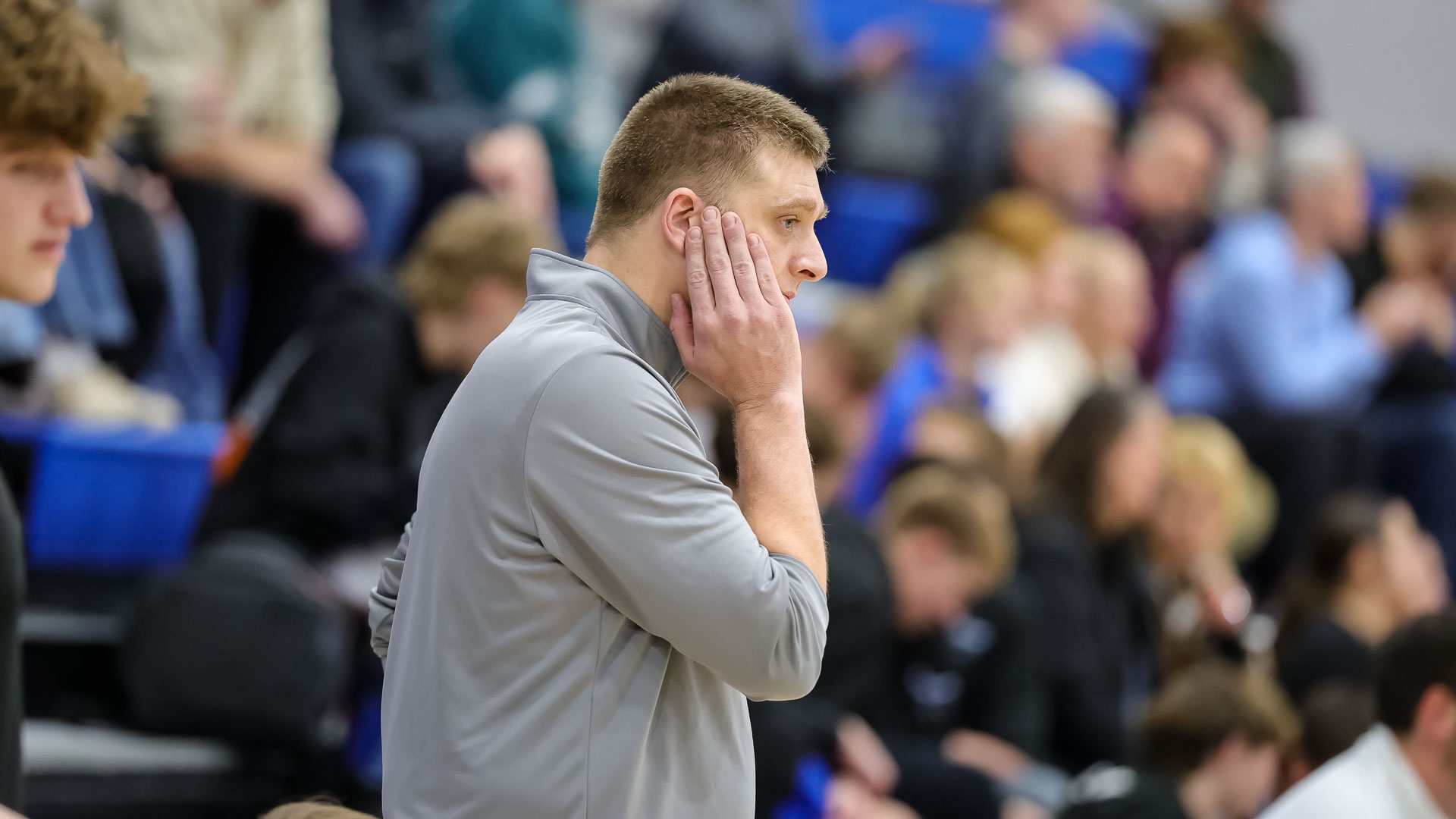 Perry-Lecompton head coach Matt Simmons puts his hand to his face in reaction to a play during a boys basketball game against Northeast Kansas Homeschool on Feb. 3 at Perry-Lecompton High School in Perry.