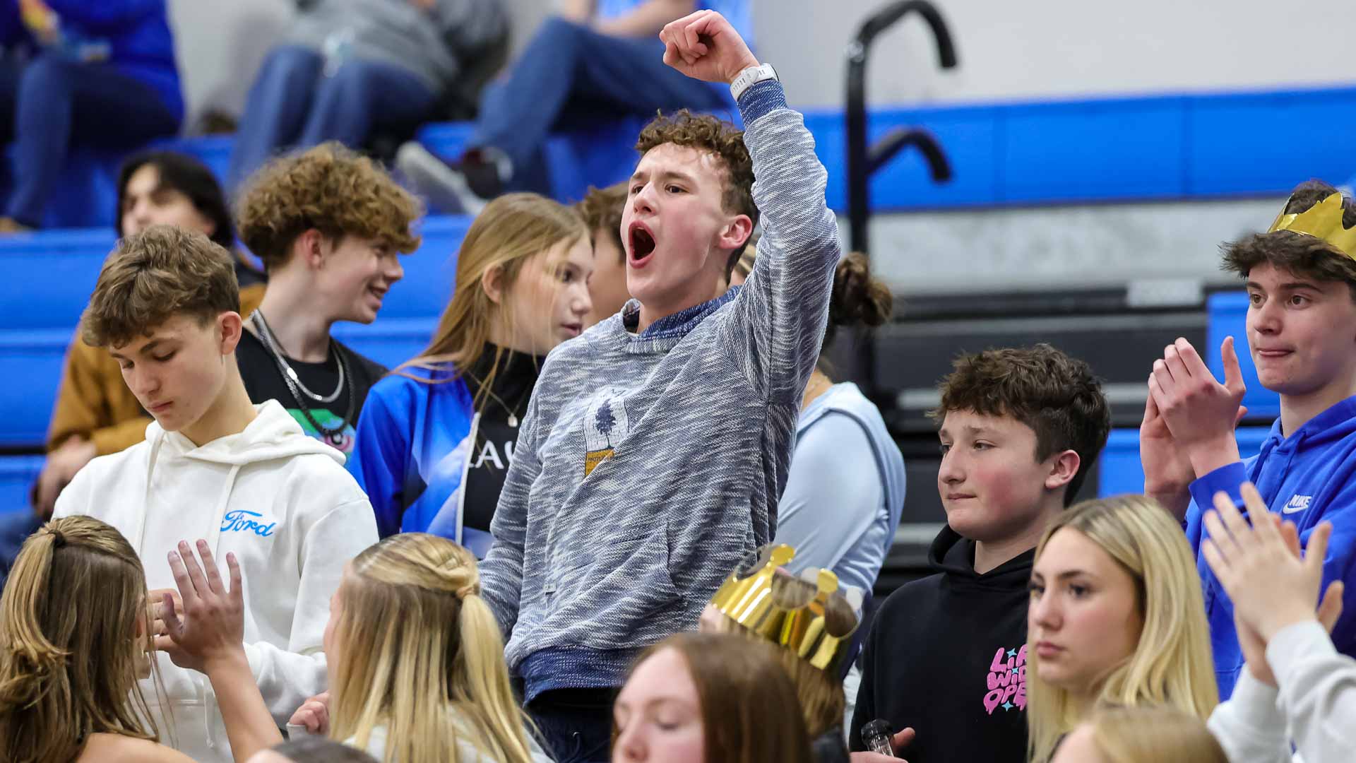 Perry-Lecompton’s student section celebrates a big-play during a boys basketball game against Northeast Kansas Homeschool on Feb. 3 at Perry-Lecompton High School in Perry.