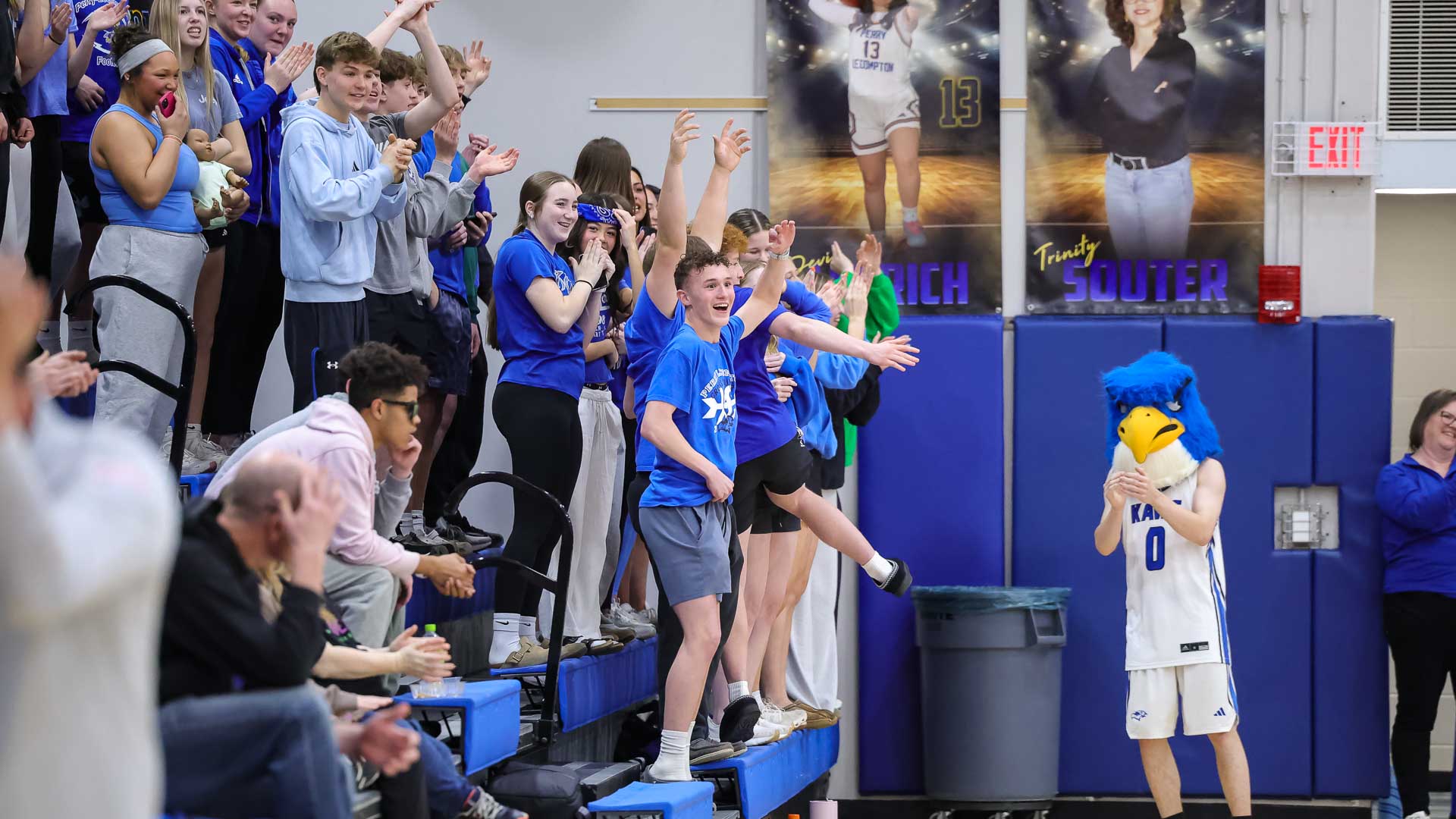 Perry-Lecompton’s student section celebrates a big play during a boys basketball game against Pleasant Ridge on Feb. 26 at Perry-Lecompton High School in Perry.
