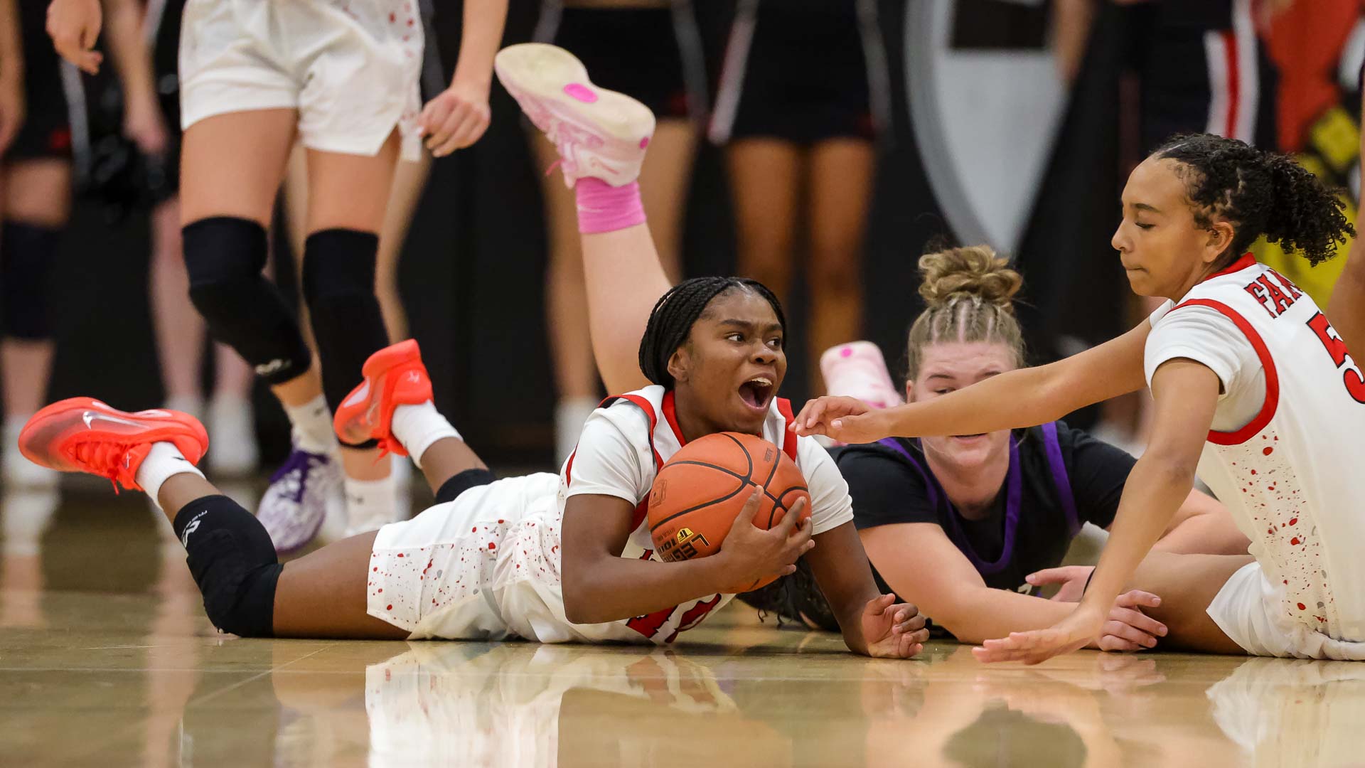Lawrence High’s Zoey Barber dives for a loose ball during a girls basketball game against Topeka West on Dec. 9 at Lawrence High School.