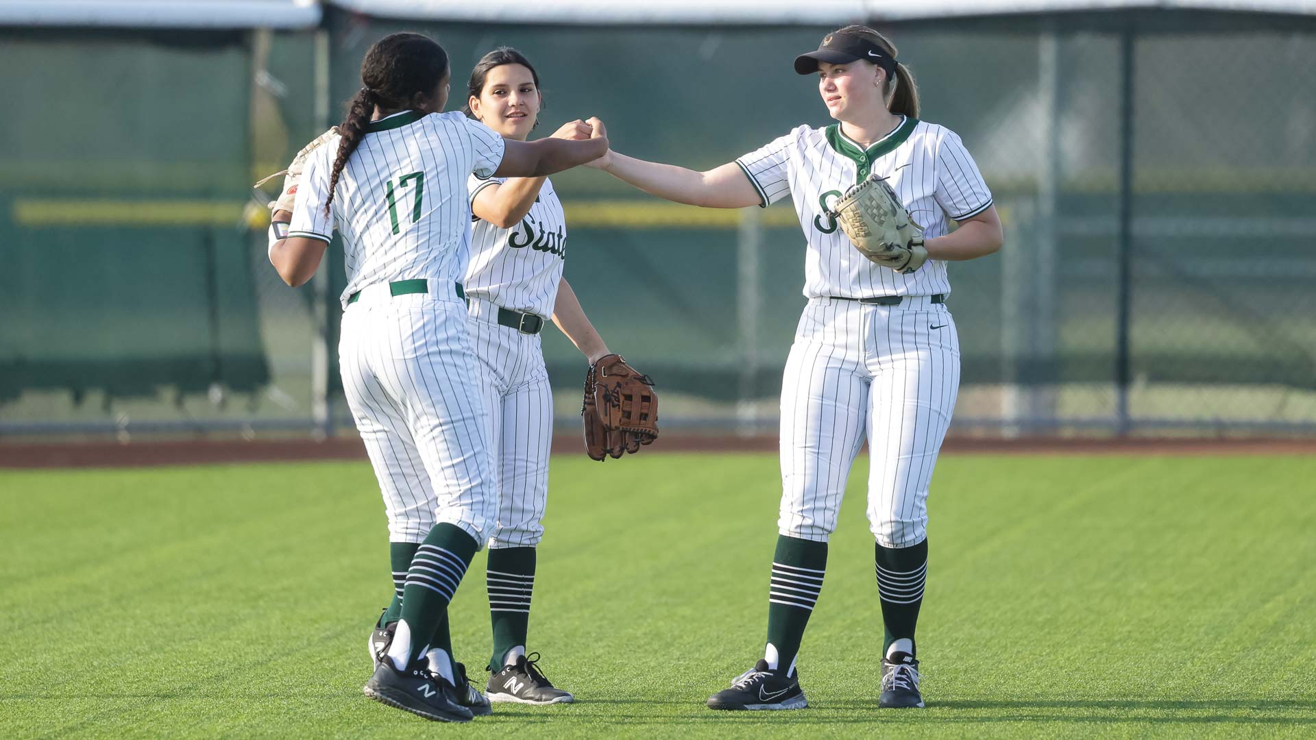 Free State’s Sarai Preston, Riley Schierling and Avery Lonnberg bump fists during a softball game against Olathe North on April 7 at Free State High School in Lawrence.