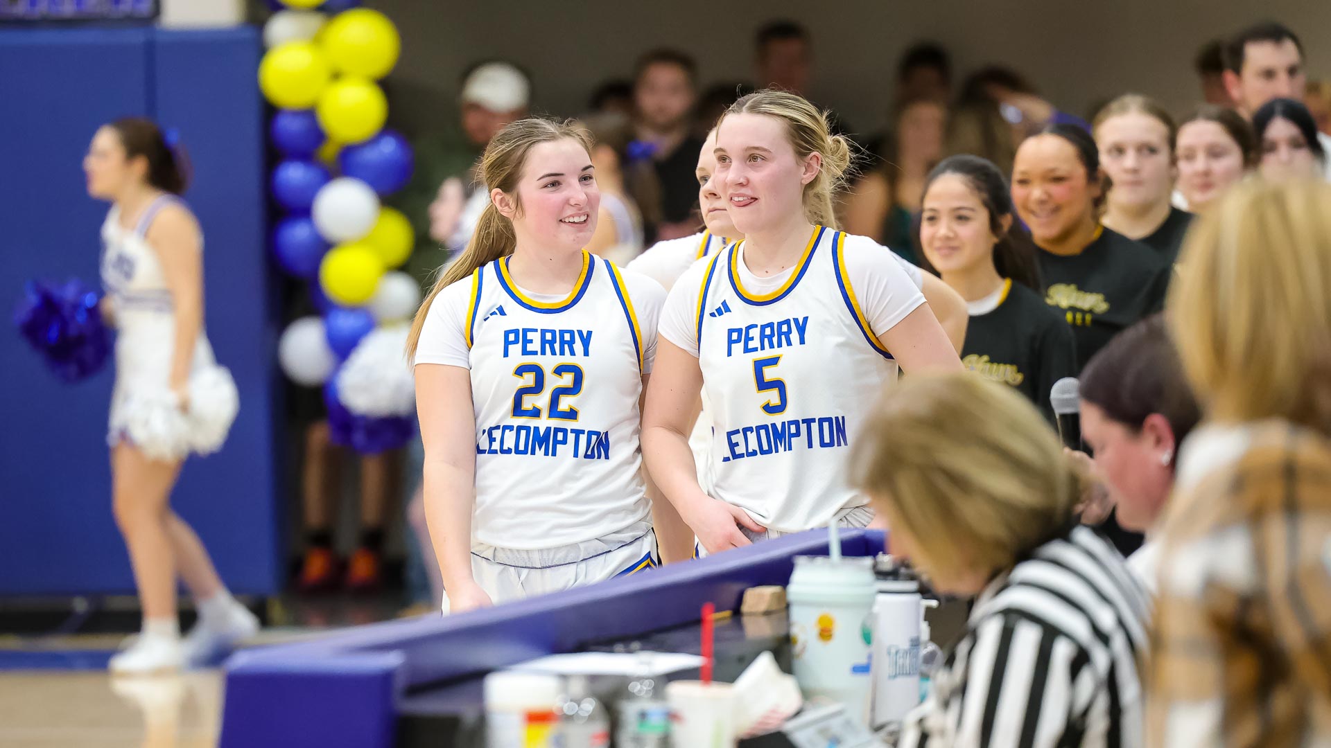 Perry-Lecompton’s Charley Blosser and Macie Corcoran smile as they head to the front of the handshake line following a girls basketball game against Northeast Kansas Homeschool on Feb. 3 at Perry-Lecompton High School in Perry.