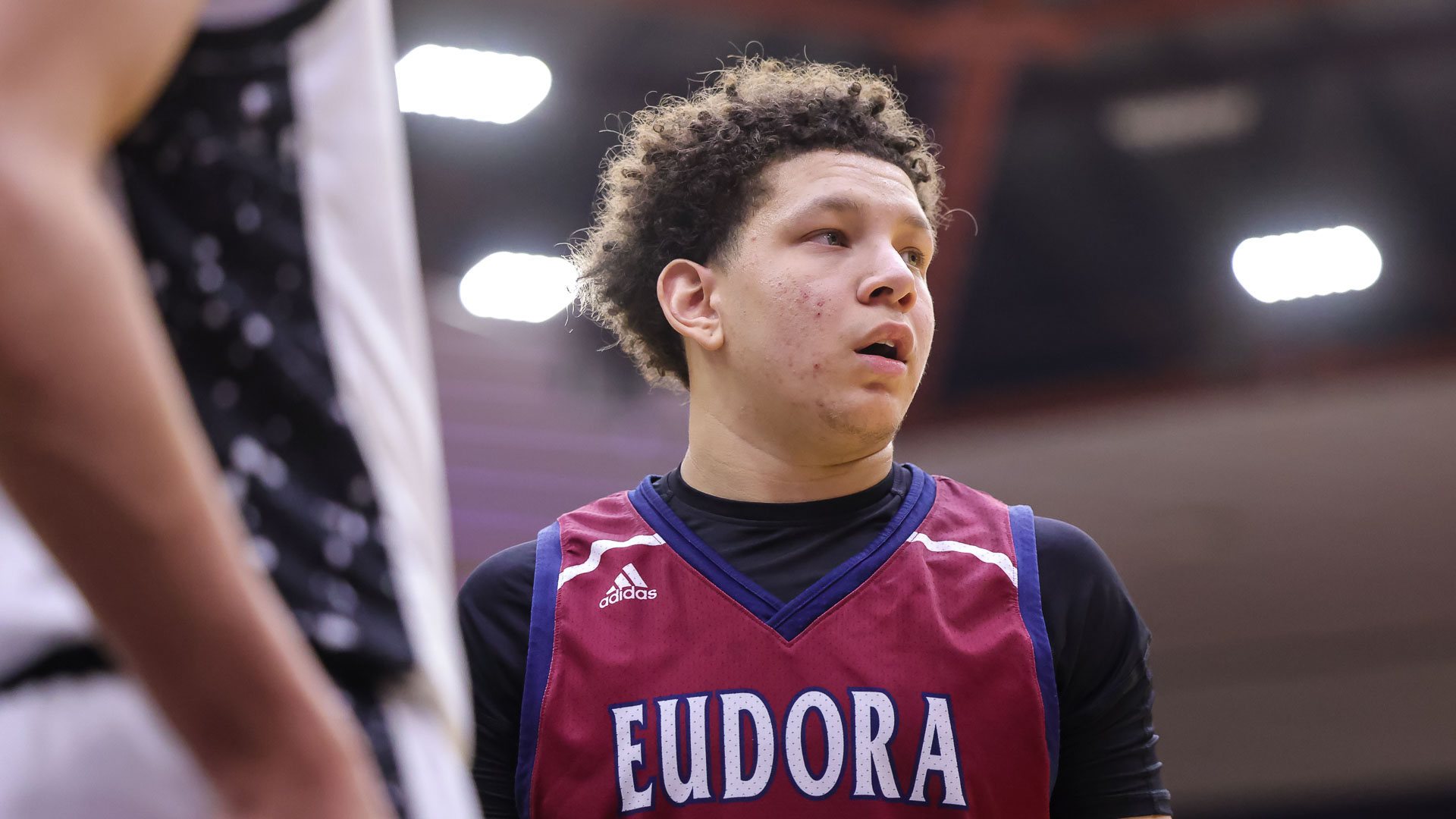 Eudora’s Keelyn Duncan listens to his coach’s instructions during a boys basketball game against Rock Creek on March 11 at Tony’s Pizza Events Center in Salina.